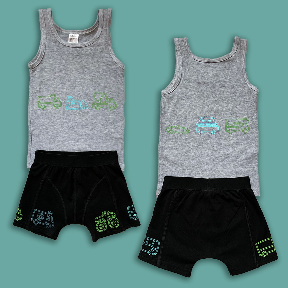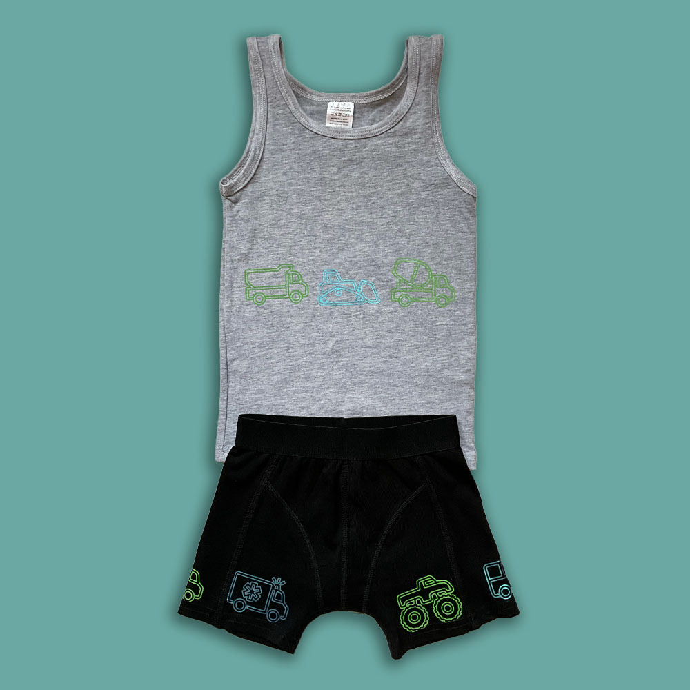 Een set van een zwarte onderbroek en grijs hemd met mooie opdruk van verschillende transportmiddelen.